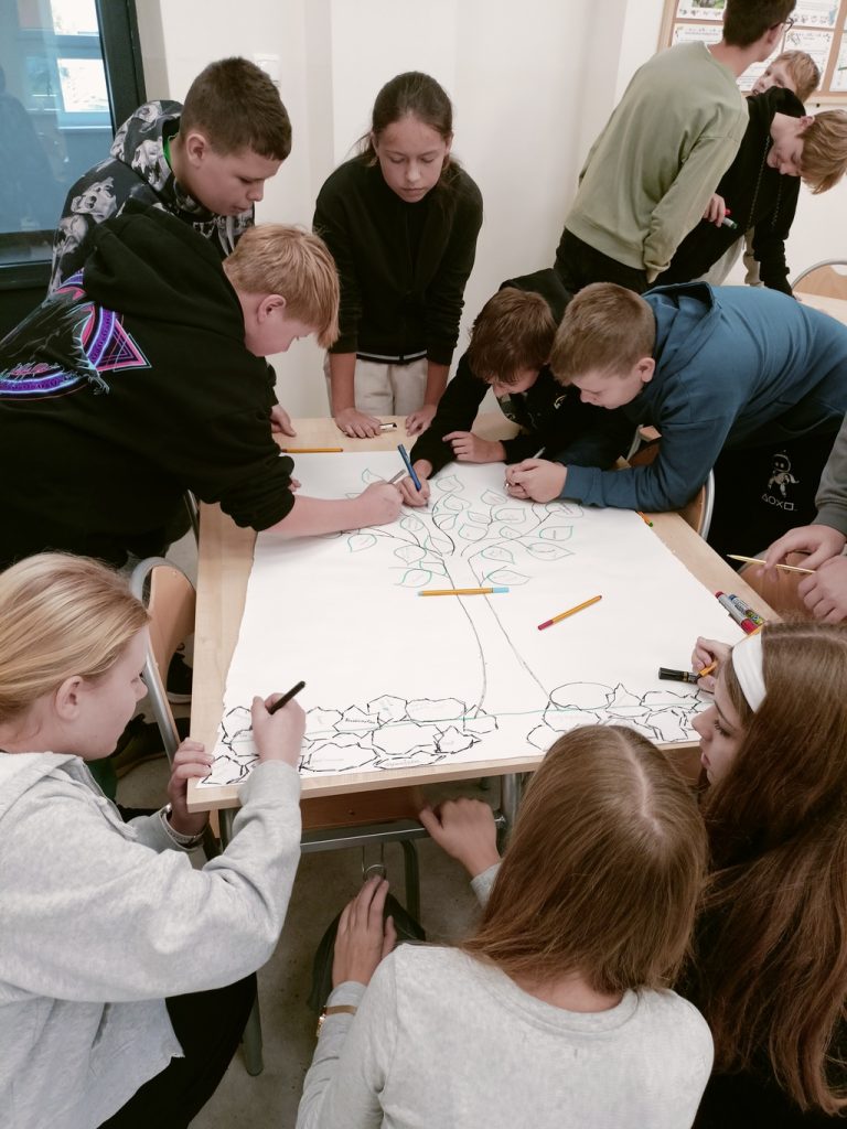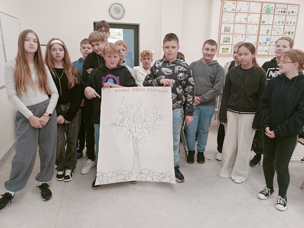 Uczniowie klasy VII B opracowali klasowe drzewo życzliwości, gdzie na liściach wypisywali dobre przykłady zachowań, które wzmacniają klasę, zaś na kamieniach- to, co osłabia przyjaźń. Co wzmacnia klasę?- pomagam, uśmiecham się, mówię zwroty grzecznościowe, chwalę za wysiłek, pocieszam, proszę o pomoc. Co osłabia klasę?- obrażane innych, wyśmiewanie błędów, popychanie i bicie, zabieranie cudzych rzeczy, ignorowanie innych, kłótnie, krzyki, wulgaryzmy. Wszyscy uczniowie aktywnie uczestniczyli w realizacji zadania.