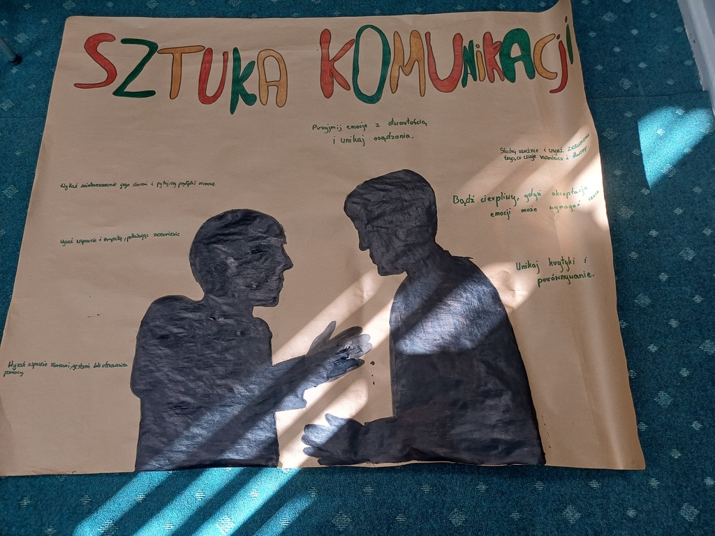 Klasa VIII A omówiła dwa zagadnienia profilaktyczne, wykonując do tego odpowiednie plakaty. Pierwsze zagadnienie dotyczyło „Sztuki komunikacji” – omówiono jak uważnie się komunikować, przedstawiono techniki komunikacyjne oraz ważność komunikatu Ty – Ja.