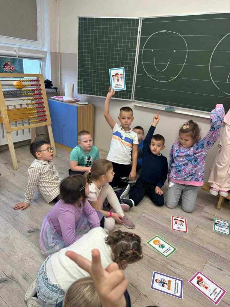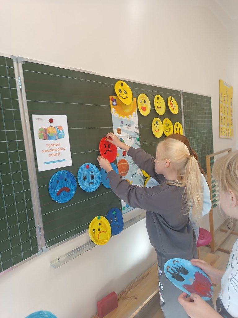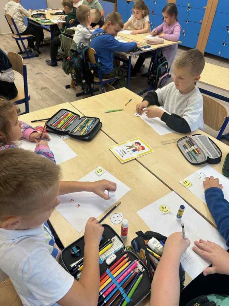 W ramach działań w klasach 1 – 3 zostały przeprowadzone zajęcia – warsztaty, podczas których uczniowie rozwijali umiejętność empatycznej komunikacji oraz uświadamiali sobie znaczenie słów w relacjach w grupie rówieśniczej. Zajęcia wspierały rozwój kompetencji społecznych takich jak empatia i wrażliwość. Wykorzystano scenariusz „Opowieść o Tymku”. Podczas pogadanek na temat wysłuchanego tekstu i własnych doświadczeń uczniowie analizowali różne sposoby komunikowania się przyglądając się temu, jakimi modelami komunikacji posługują się w relacjach rówieśniczych. Podczas prac w grupach uczniowie stworzyli plakaty na temat: „Jak zachować się wobec osoby, która potrzebuje pomocy” „Sposoby pomocy osobie, która jej potrzebuje”, ,,Jak poznać, że ktoś potrzebuje pomocy”, ,, Jak chcemy się traktować”. Podczas pracy indywidualnej uczyli się zamieniać myśli nieprzyjemne na pozytywne. Przeprowadzono gry i zabawy integrujące zespoły klasowe, zaznaczano na barometrze uczuć swoje samopoczucie w szkole. W trakcie zebrań z rodzicami przeprowadzono rozmowy na temat budowania relacji rodziców z dziećmi oraz przedstawiono ścieżki działania, kiedy ich dziecko doświadcza przemocy rówieśniczej.