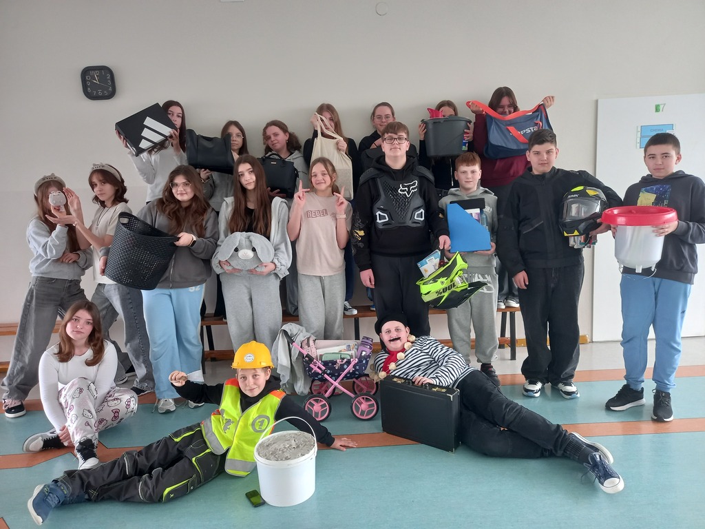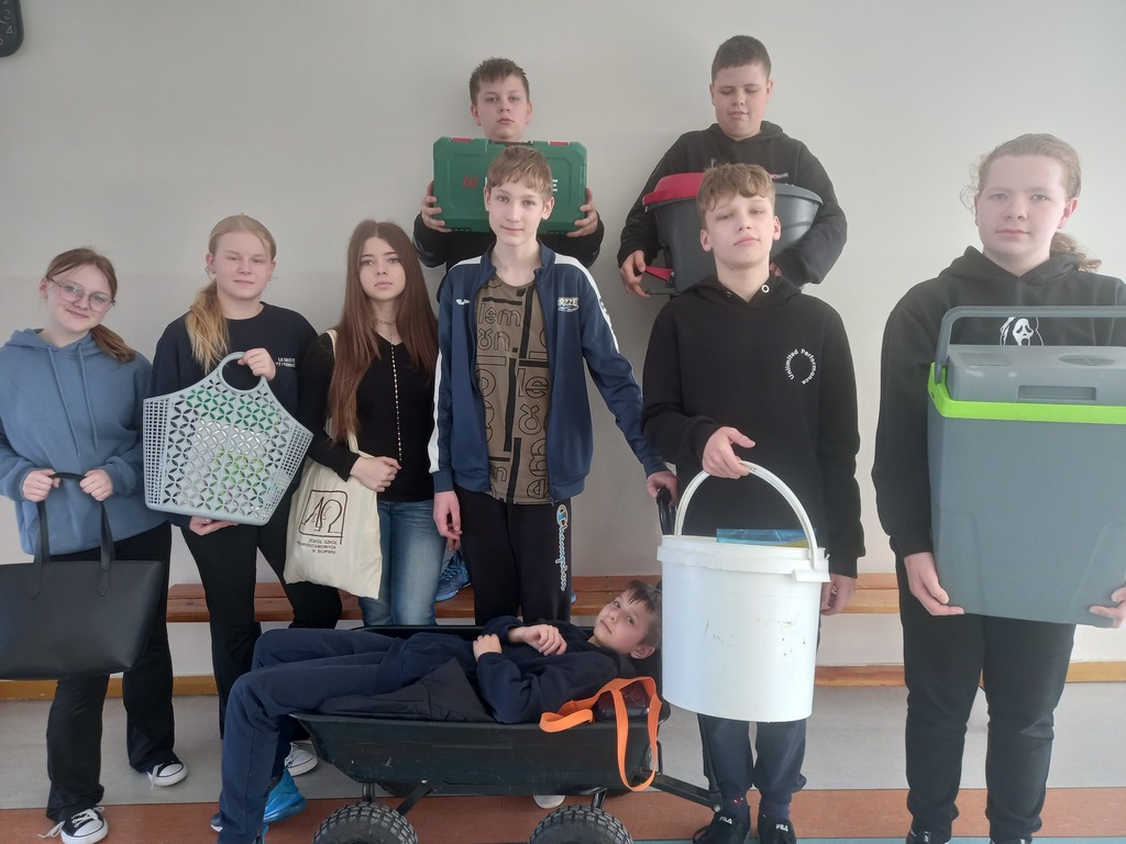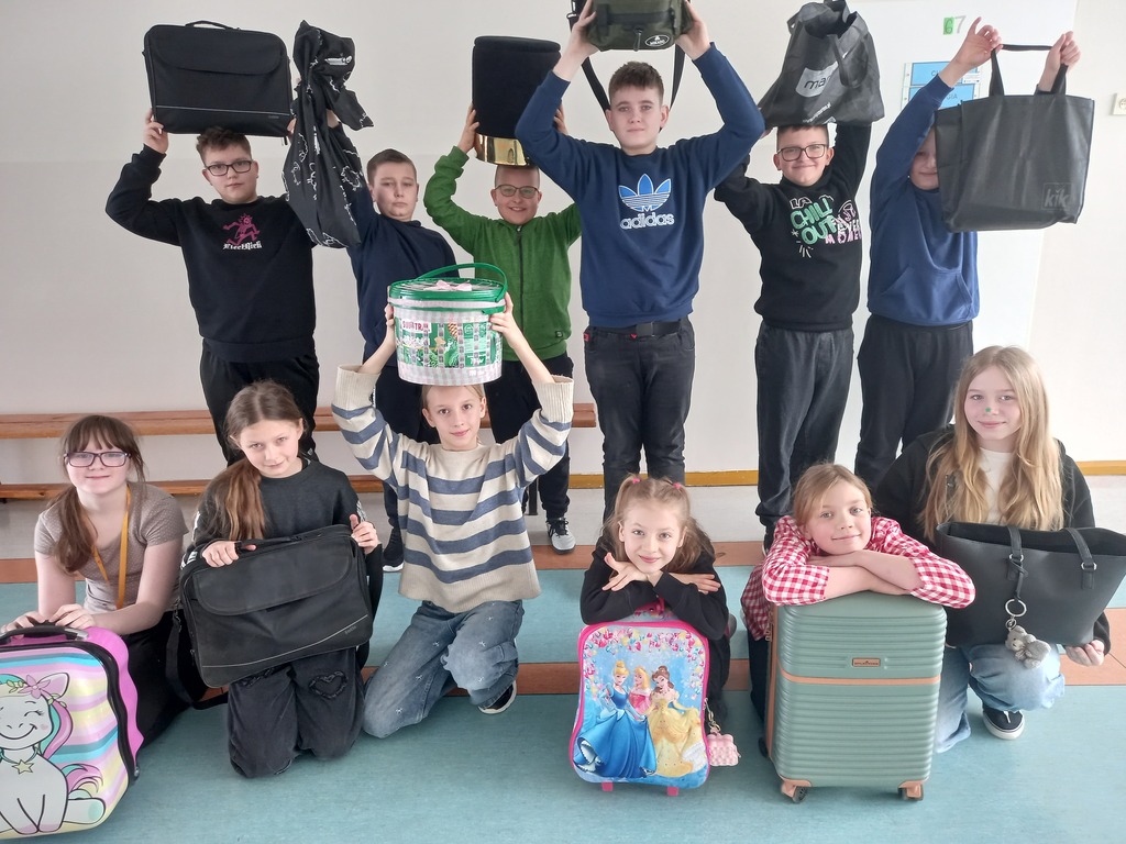 1 kwietnia wszyscy chętni uczniowie klas IV-VIII wzięli udział w akcji Samorządu Uczniowskiego DZIEŃ BEZ PLECAKA, polegającej na przyniesieniu książek i przyborów szkolnych we wszystkim, tylko nie w plecaku. Liczył się pomysł. Zamiast tradycyjnych plecaków uczniowie wykorzystali: taczki, opony, walizki, koszyki, dziecięce wózki, poszewki na poduszki, skrzynki na narzędzia, kaski, wiadra. Książki przyniesiono nawet w pufie i beczce. Dodatkowo uczniowie ubrali się w kolorowe, zwariowane stroje. Okazało się, że wyobraźnia naszych wychowanków nie zna granic.