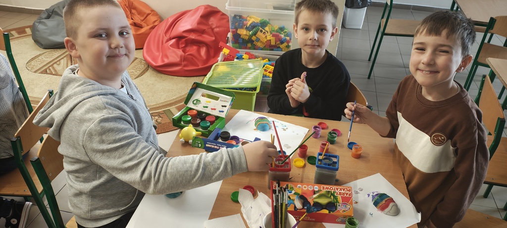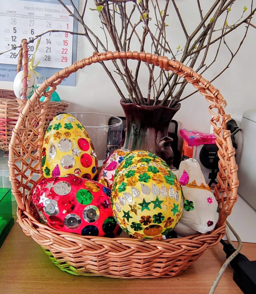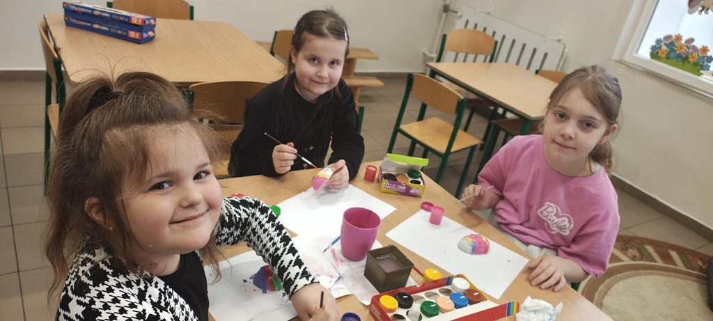 Przed świętami Wielkiej Nocy dzieci wykonywały ozdoby: malowały gipsowe jajka farbami, malowały i dekorowały jajka ze styropianu cekinami. Wykonane prace ozdobiły szkolną świetlicę.
